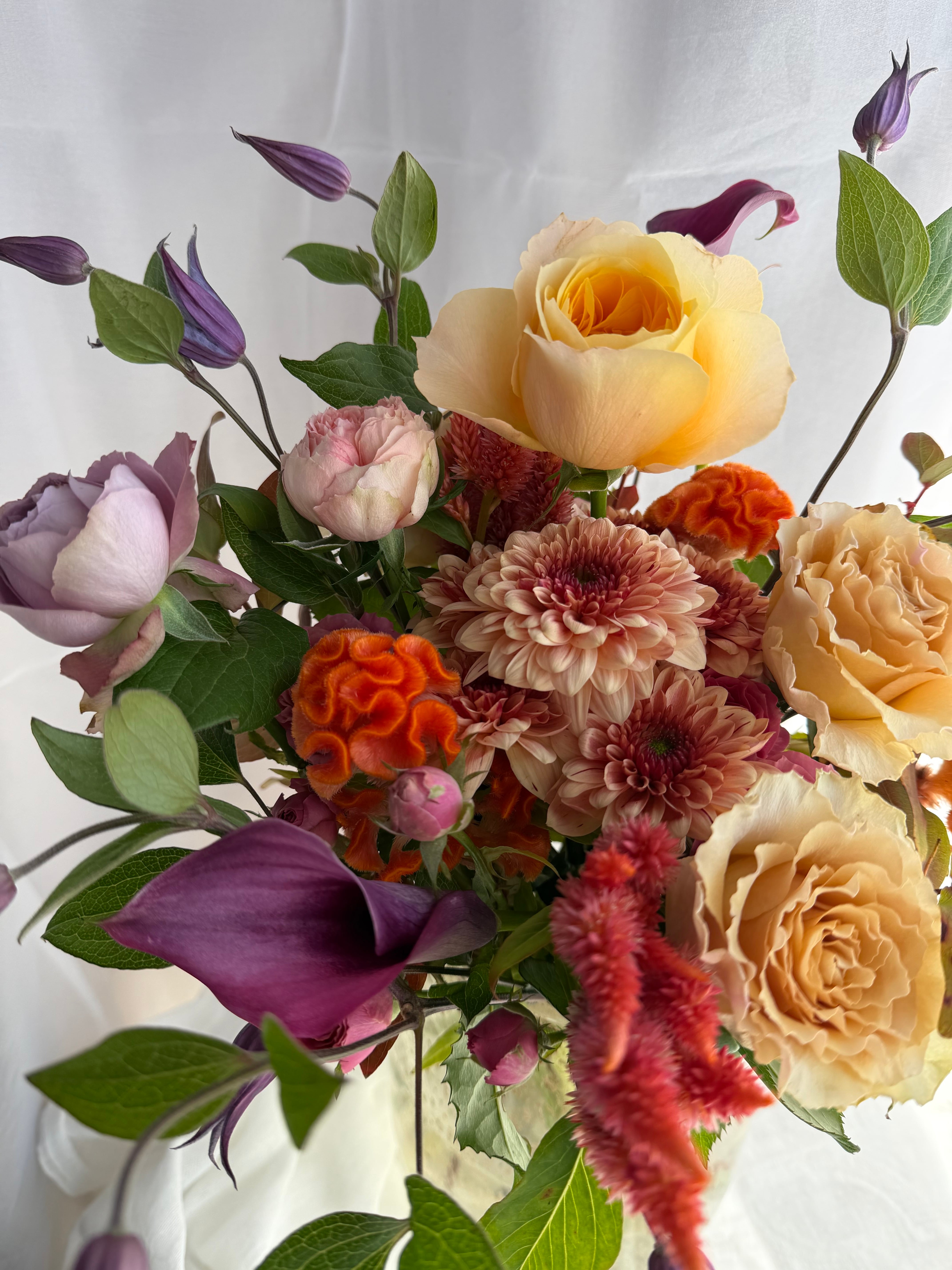 他にもクレマチスやカラー、ケイトウなども入れてシックな雰囲気に仕上げています。